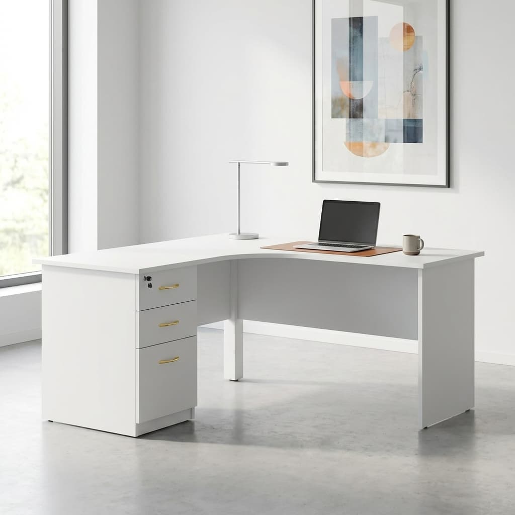 With its modern minimalist design, neutral color finish, and sturdy structure, the L-Shaped Desk blends seamlessly into corporate offices, executive workspaces, or home offices. Its space-saving corner configuration makes it an excellent choice for maximizing productivity while maintaining a clean and organized workspace.