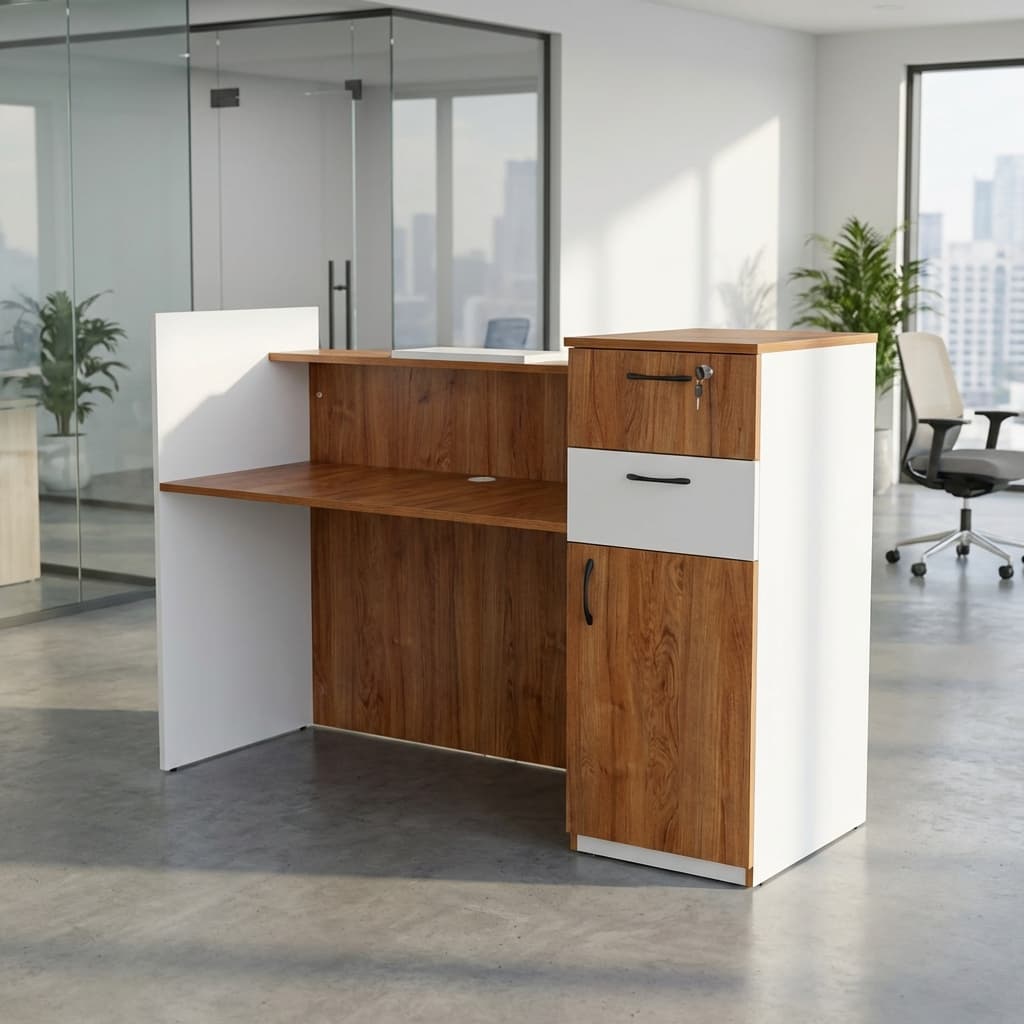With a spacious 1.6-metre width, it provides ample working space for reception tasks, computers, paperwork, and customer interaction while maintaining a clean and organized appearance.