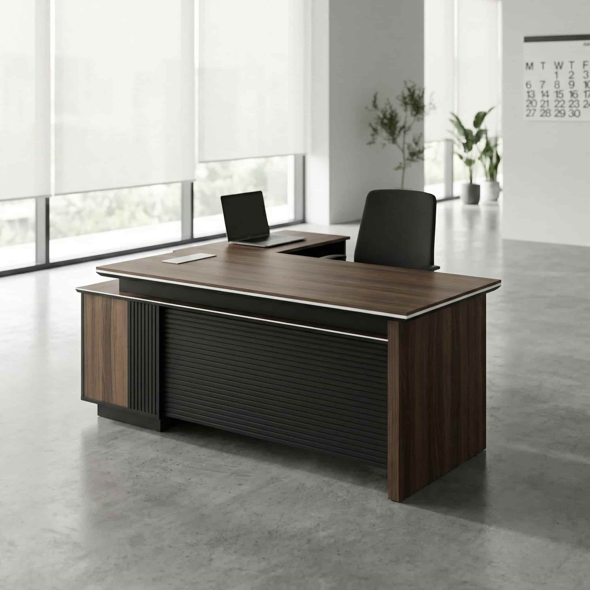 The 1.8m Executive Office Desk is designed for leaders who value authority, functionality, and refined aesthetics. With its bold modern silhouette, premium wood finish, and integrated side extension, this desk delivers both visual presence and practical workspace efficiency.
