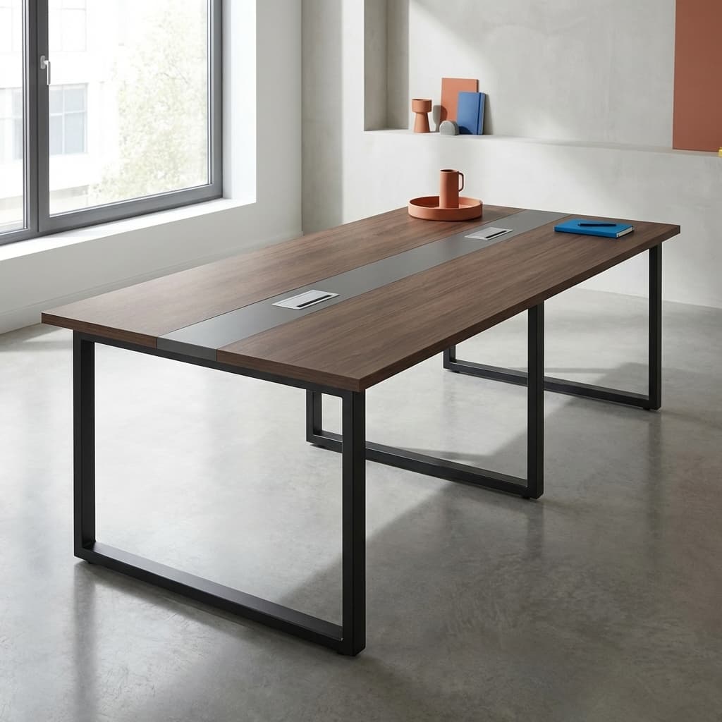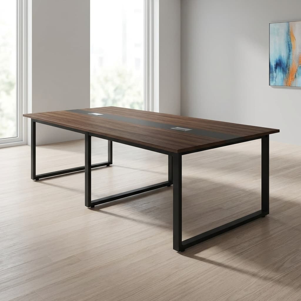 In addition, the table is supported by strong metal legs, which provide excellent stability and a modern office aesthetic. The metal frame complements the wooden top, creating a balanced design that fits well in contemporary boardrooms and meeting spaces.