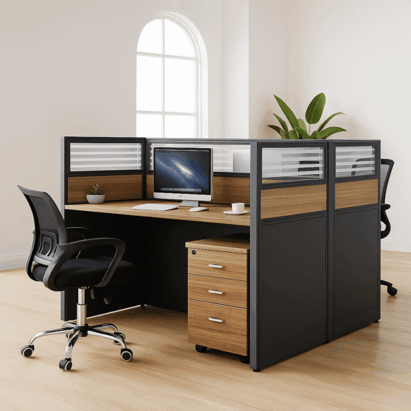 Upgrade your workspace with this professionally styled 2-way modular workstation. Designed for productivity and privacy, it features a rich wood-grain desktop, frosted glass partitions, and mobile storage drawers—perfect for team collaboration in open-plan offices.