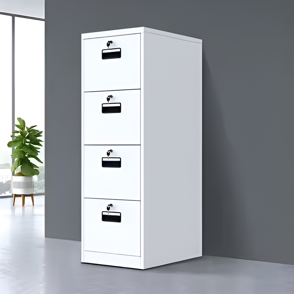 Secure, organized, and built for high-performance environments, this 4-Drawer Metal Filing Cabinet is the ideal storage solution for any professional office, institution, or archive room. Rendered in a crisp white finish and complemented by modern black handles with integrated label holders, each drawer offers ample space for documents, files, and records—while individual key locks ensure enhanced security.