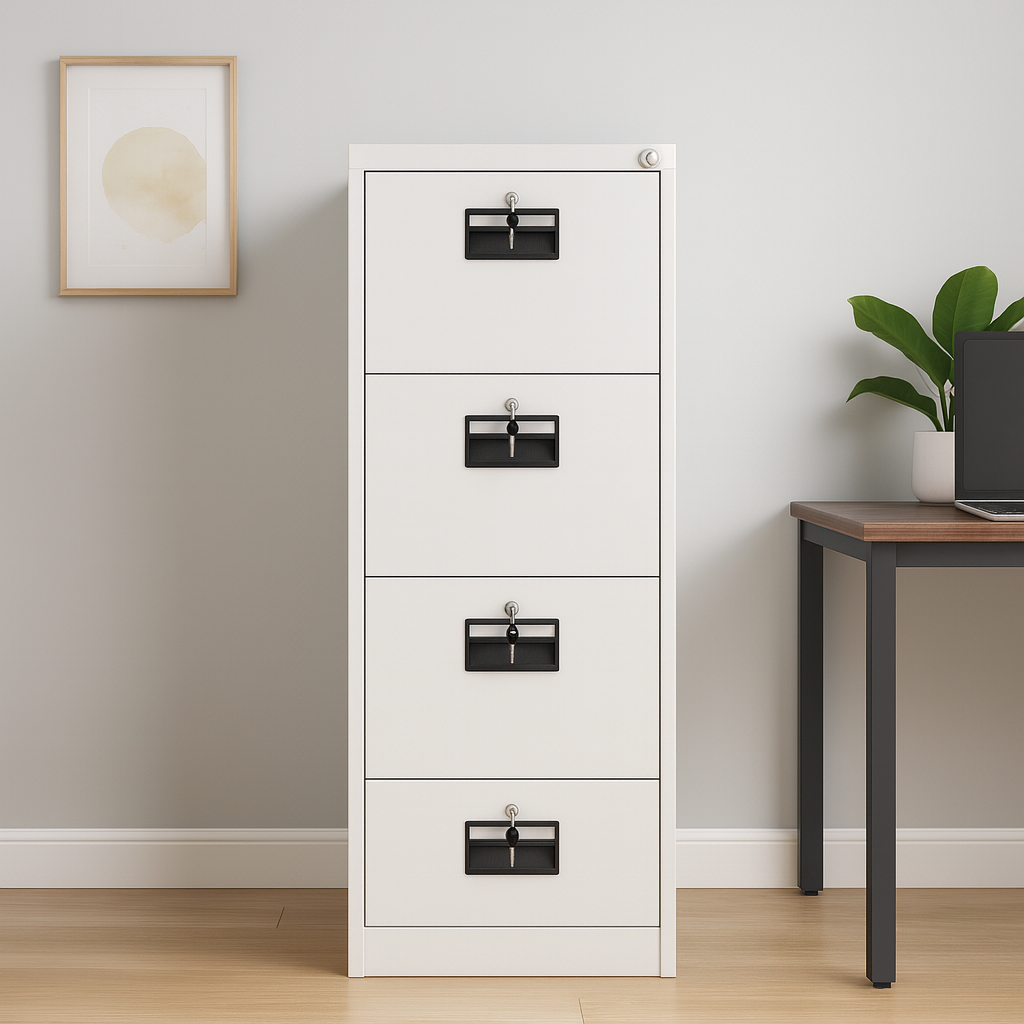 Secure, organized, and built for high-performance environments, this 4-drawer metal filing cabinet is the ideal storage solution for any professional office, institution, or archive room. Rendered in a crisp white finish and complemented by modern black handles with integrated label holders, each drawer offers ample space for documents, files, and records—while individual key locks ensure enhanced security.