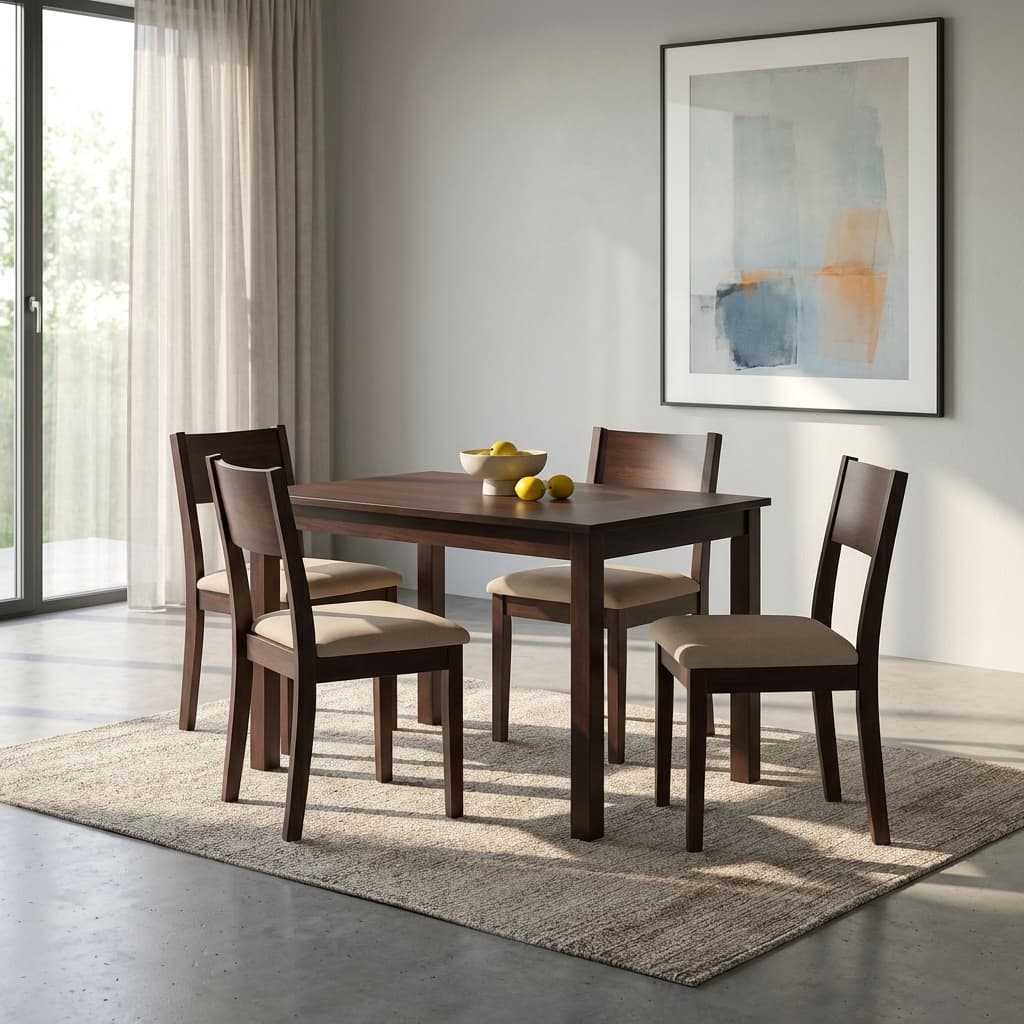 The 4-Seater Wooden Dining Table Set is designed to bring both comfort and style into your dining space. It works perfectly in apartments, small dining rooms, and modern kitchens. Because of its compact size, it fits well without overcrowding your space.