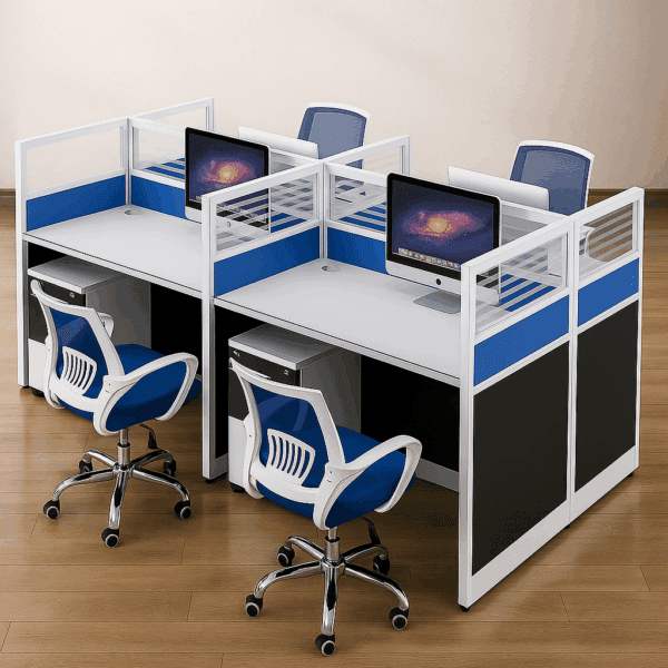 Be the first to review “4-Way Modular Workstation – White, Blue & Grey with Frosted Glass Dividers”