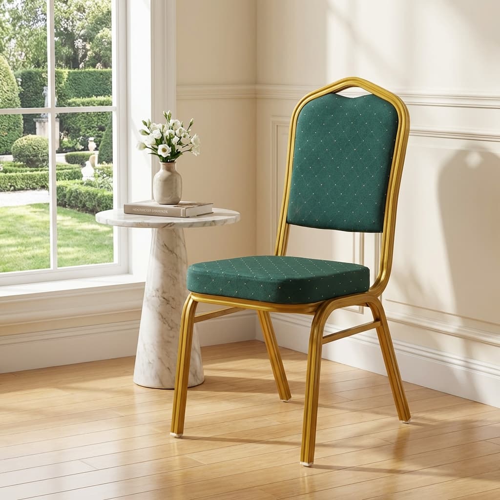Add a touch of class and sophistication to your events with this Elegant Banquet Chair featuring a luxurious gold-finished frame and a comfortably padded upholstered seat. Designed for both style and durability, this chair is ideal for weddings, conferences, hotels, churches, and high-end events. The softly cushioned seat and supportive backrest ensure guest comfort even during long sittings, while the sturdy metal frame provides reliable strength for frequent use. Its timeless design blends effortlessly with both modern and classic décor themes.