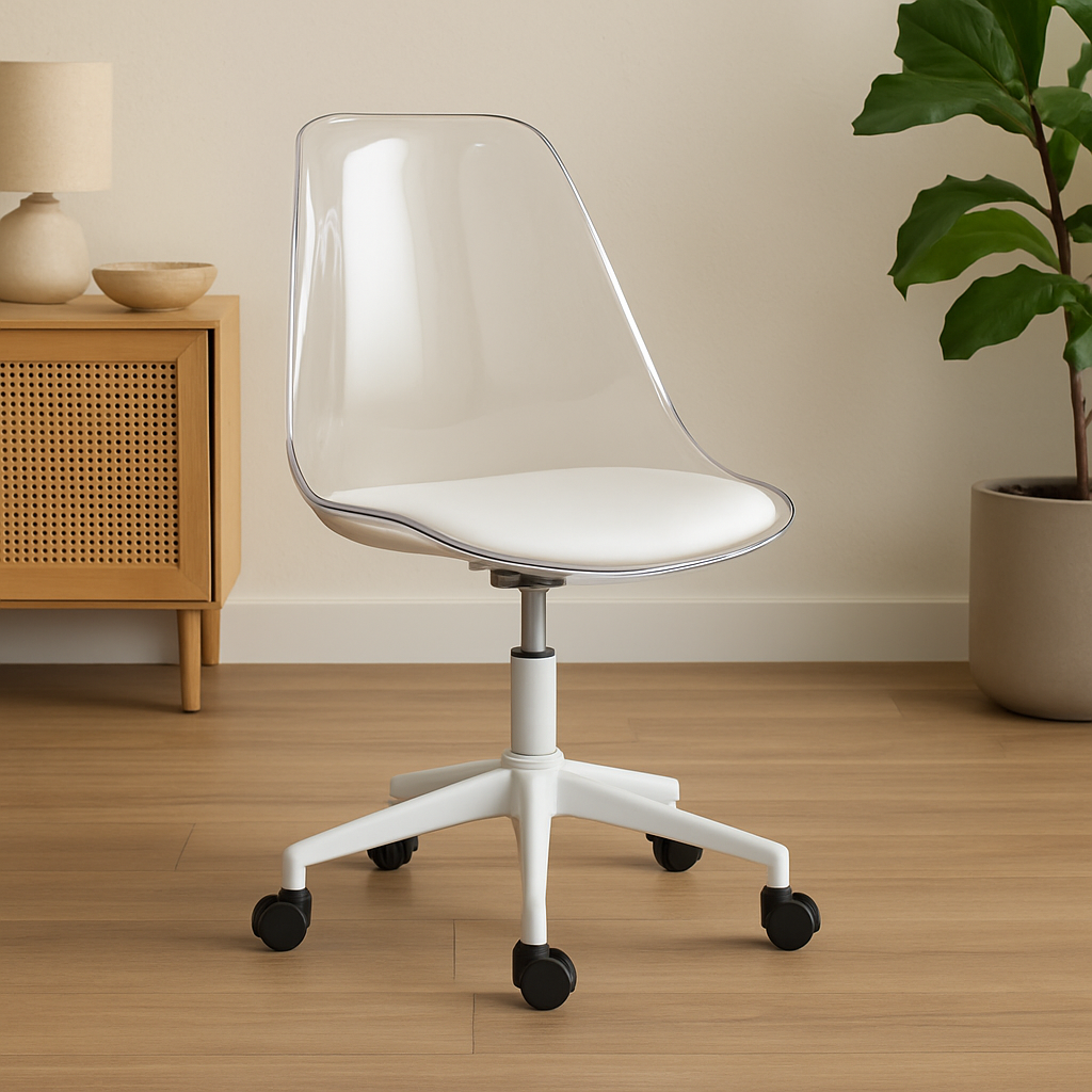 This transparent Eames Swivel seat blends modern elegance with everyday functionality, making it a versatile choice for home offices, study areas, and workspaces. The clear acrylic shell creates a sleek, airy look, while the cushioned seat ensures comfort during long hours of use. Available in both white and black cushion options, it easily adapts to different interior styles. The Eames Swivel seat is built with a sturdy base and smooth caster wheels, offering stability and easy mobility across various floor types.