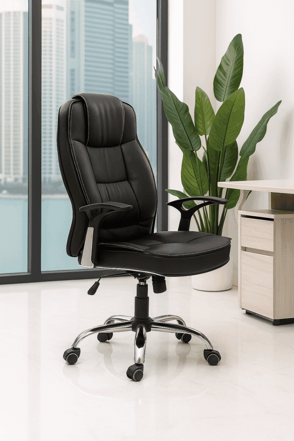 Add sophistication and comfort to your workspace with this high-back executive chair, crafted in premium black faux leather with ergonomic features and modern styling. Designed for long working hours, it offers superior support, smooth mobility, and a polished look for any professional environment.