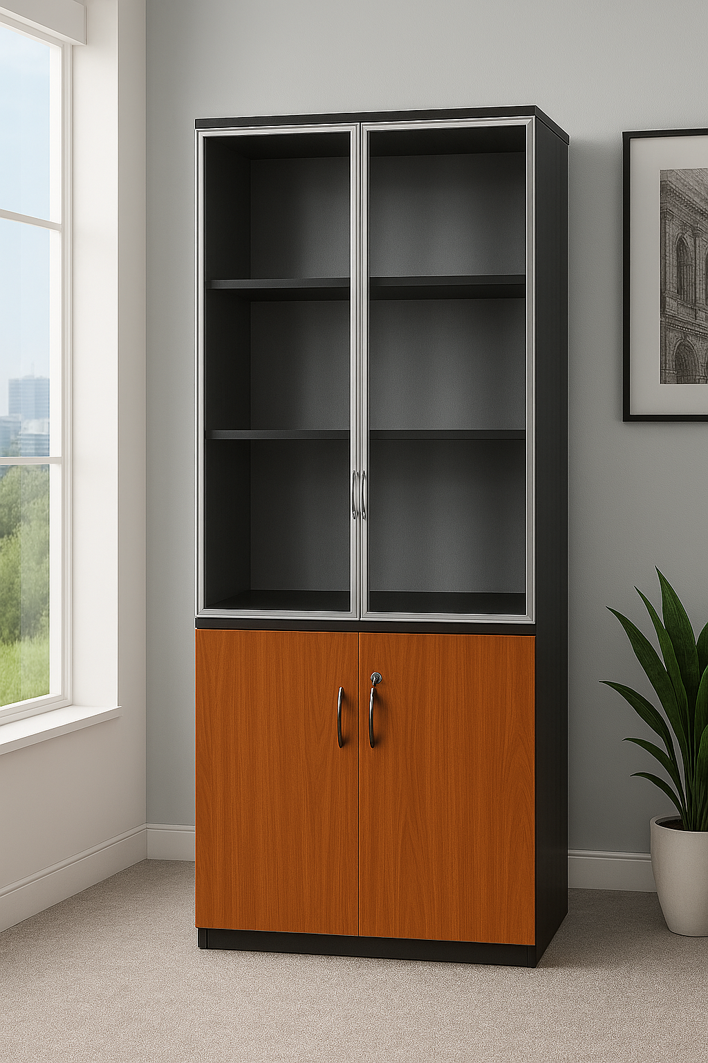 The Glass Wooden Office Display Cabinet combines elegance with practicality, making it ideal for showcasing documents, awards, or decorative items while offering secure lower storage. Featuring sleek aluminum-framed glass doors on the top and a warm wood veneer base with lockable cabinet doors, this unit blends seamlessly into both corporate and executive environments.
