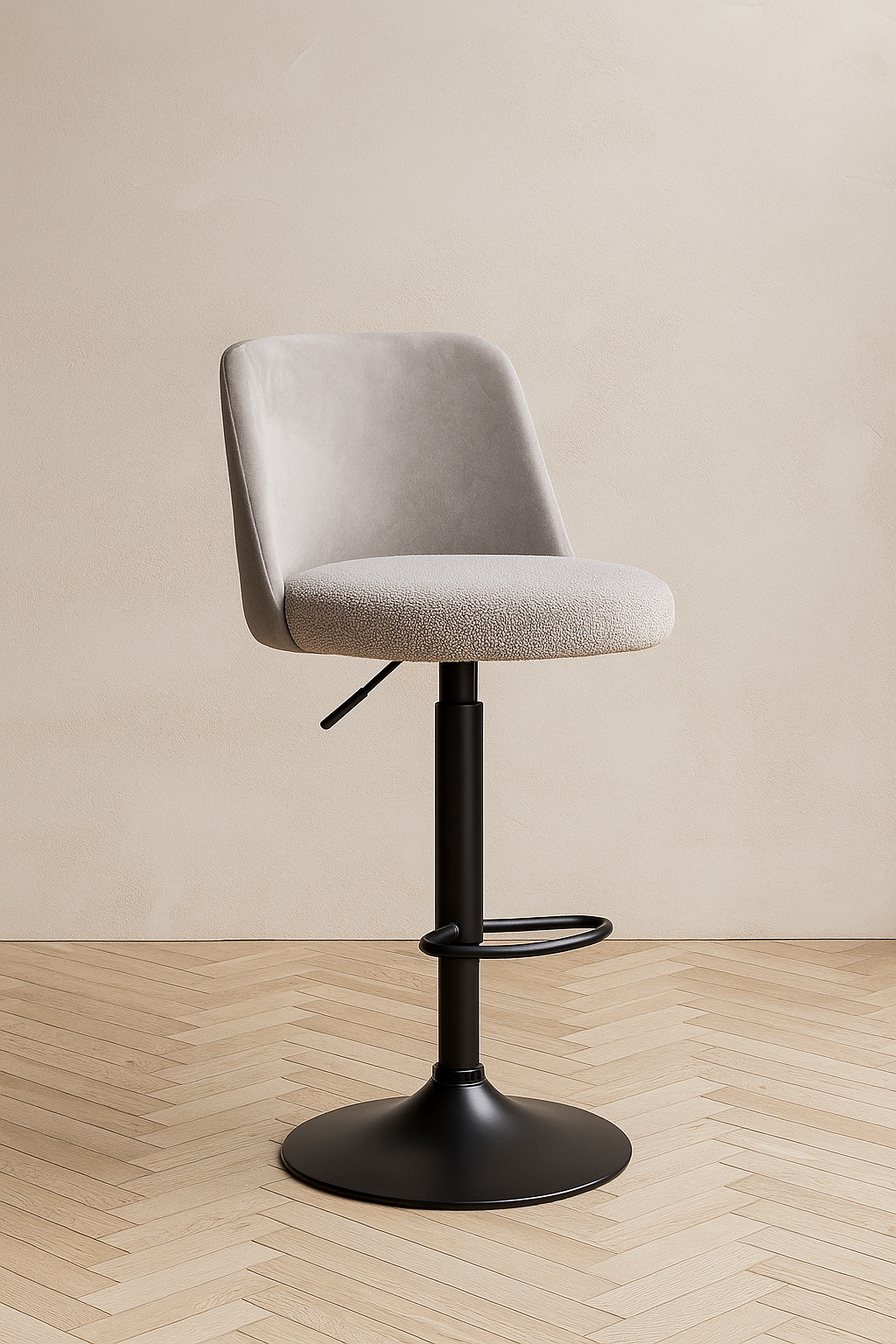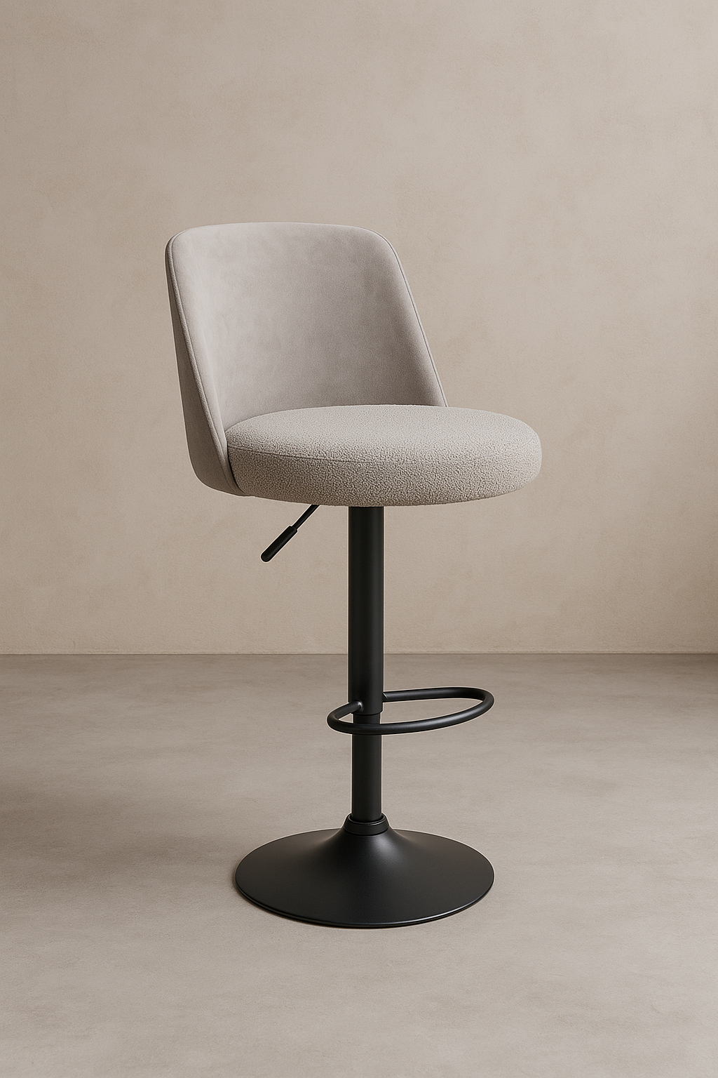 Padded seat with textured boucle-style upholstery for added comfort.