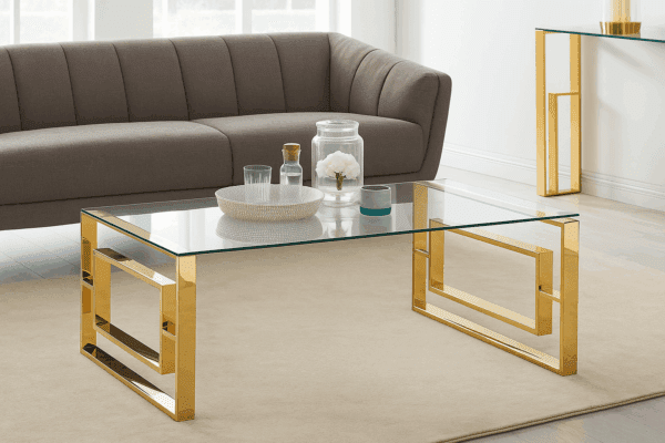 Refined elegance meets contemporary design in this modern rectangular glass coffee table. Featuring a sleek clear tempered glass top supported by a striking gold-finished metal base, this piece is an instant focal point in any living space. Perfect for upscale homes, lounges, or waiting areas, the open and airy structure makes the room feel bright, stylish, and modern.