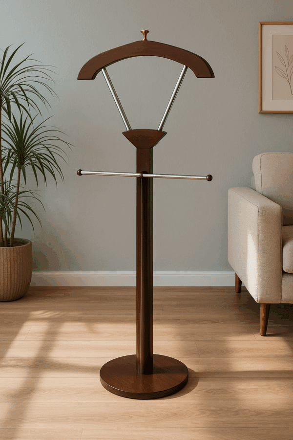 Bring timeless elegance to your space with this contemporary valet stand—expertly crafted for both function and finesse. Perfect for the modern gentleman or stylish professional, this piece blends dark polished wood with stainless steel accents, offering a sleek solution for keeping your garments crisp and organized.