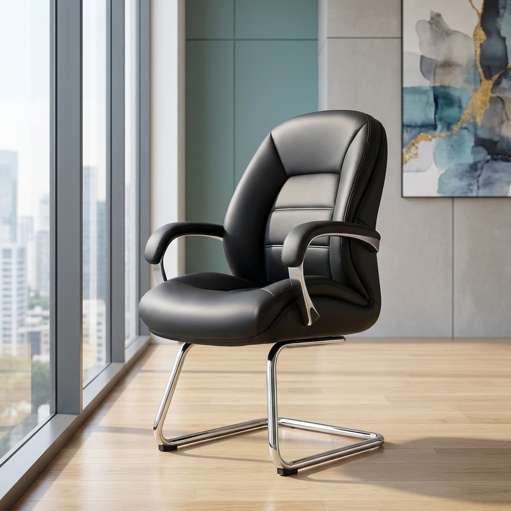 This chair features a high-back cushioned design that supports the back and shoulders. The padding feels firm and comfortable, allowing guests to sit through meetings without strain. The curved backrest helps maintain a natural sitting posture.