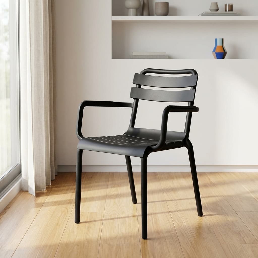 The Outdoor Arm Chair Black is a sleek, modern seating solution designed for both indoor and outdoor environments. With its clean lines and minimalist black finish, this chair adds a contemporary touch to patios, balconies, gardens, cafés, and even indoor dining or waiting areas.