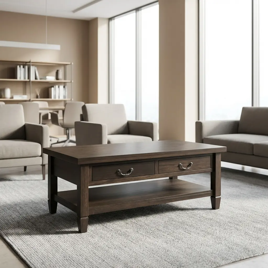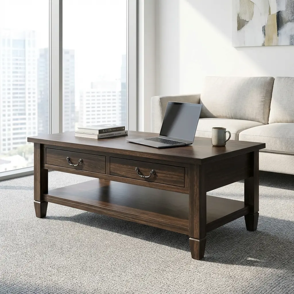 This coffee table also features two integrated storage drawers, offering ample space to keep your living room essentials neatly organized. The drawers provide a convenient way to store items such as remote controls, magazines, notebooks, or other daily accessories while maintaining a clutter-free tabletop. The enclosed drawer design also ensures privacy for your stored items.