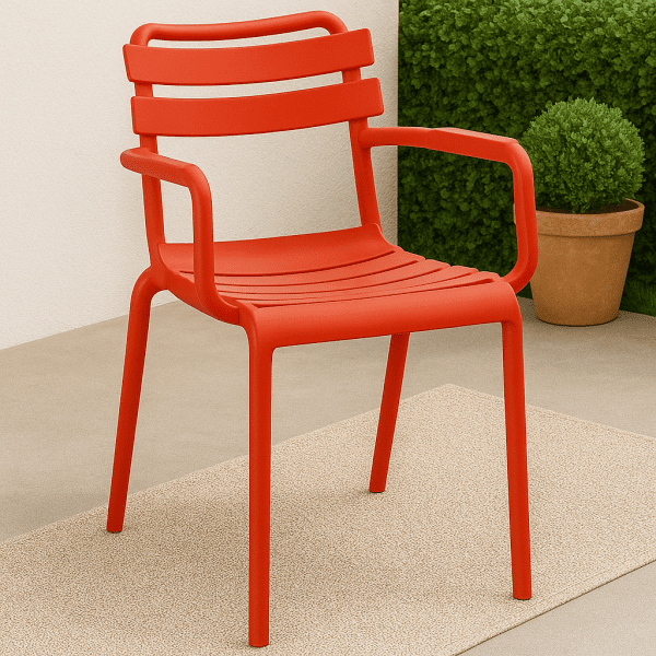 The Ruby Bistro Plastic Chair is a vibrant and modern seating choice designed to bring color, comfort, and durability to any space. Crafted from high-quality molded plastic in a rich red finish, this bistro plastic chair combines elegance with practicality. Its slatted backrest and curved armrests provide ergonomic support, making it ideal for long sitting hours in cafés, restaurants, patios, or home dining areas. Lightweight, weather-resistant, and stackable, it’s a perfect blend of functionality and style for both indoor and outdoor use.