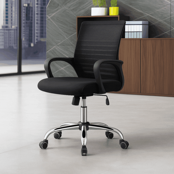 Designed for modern workspaces, this mid-back mesh office chair combines breathable support with everyday functionality. Its sleek silhouette, contoured backrest, and chrome base deliver both style and performance for home offices and professional environments.