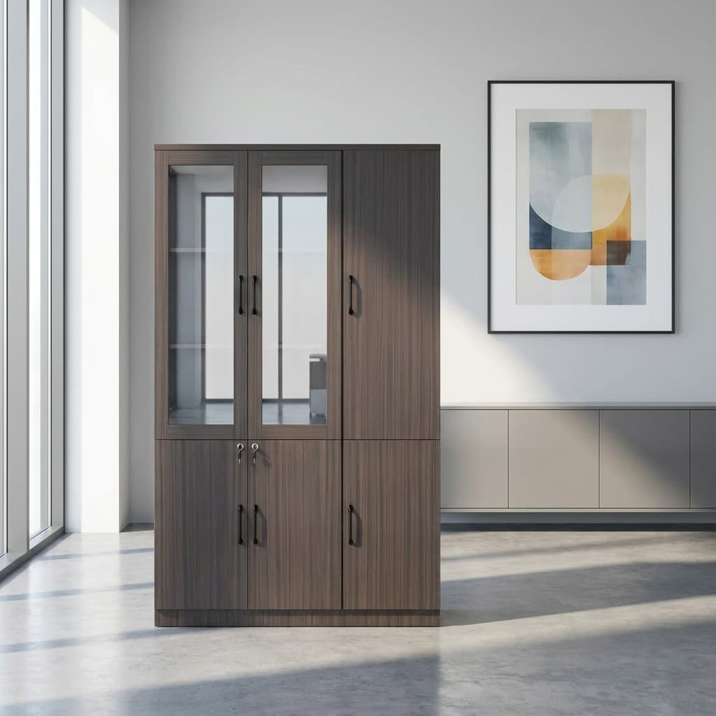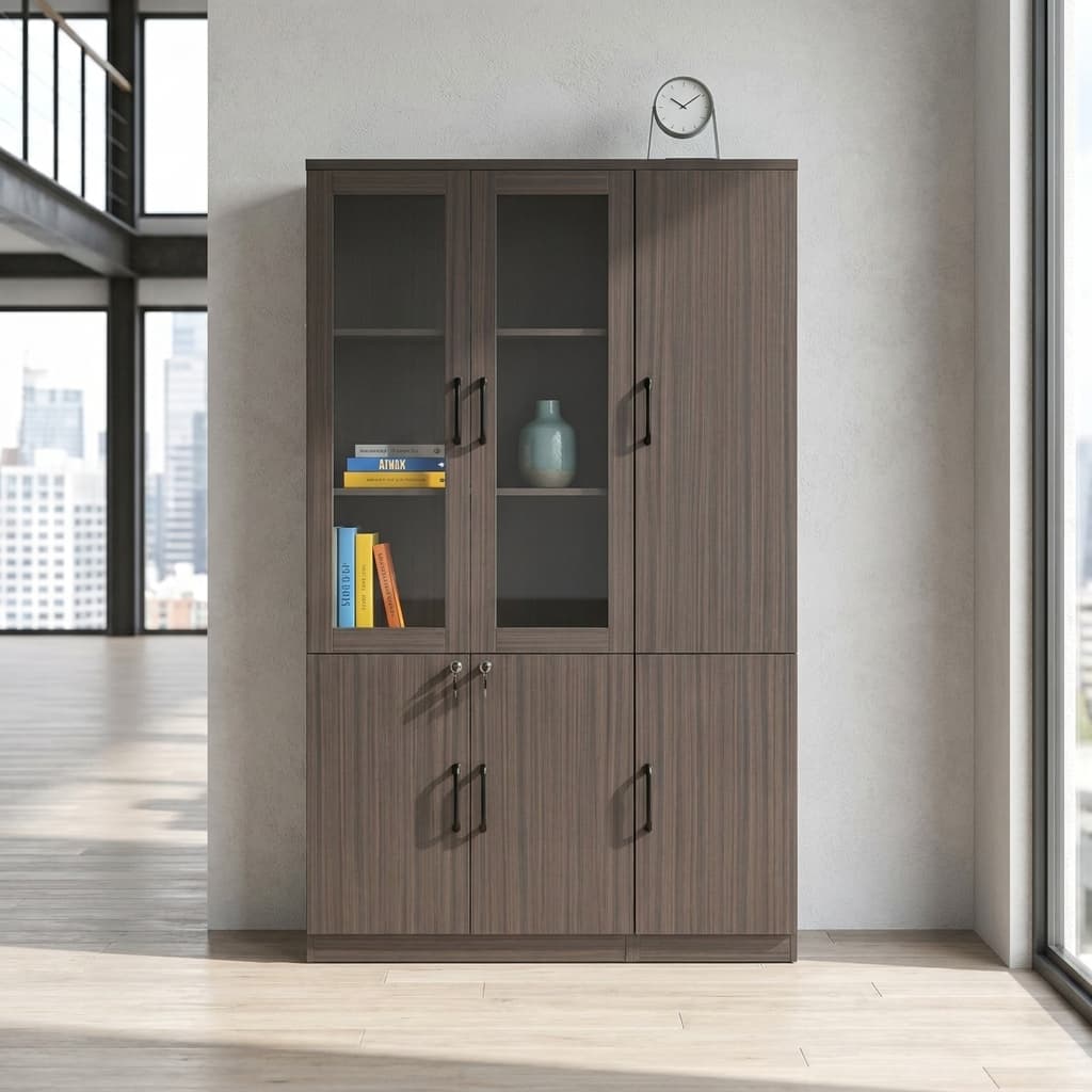 First, the bookcase features a balanced layout with both glass and solid doors. The upper section includes glass doors. Therefore, it allows you to display books, décor, or files neatly. At the same time, it keeps items protected from dust. In contrast, the lower section has solid lockable doors. This provides secure storage for confidential documents and office supplies.