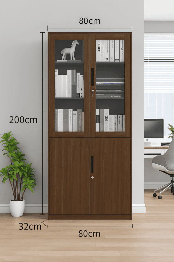 Organize your office in style with this sleek and functional tall wooden cabinet. Featuring a clean walnut finish, glass-paneled upper doors, and secure lower storage, it’s the perfect blend of display and concealment for modern workspaces.